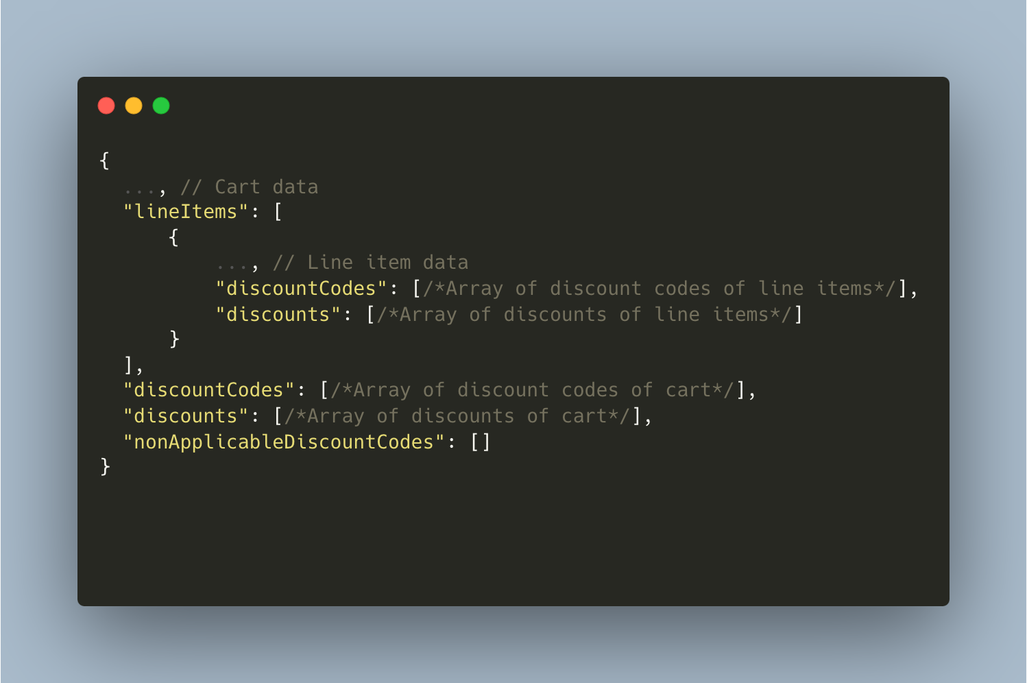 - discountCodes - an array of DiscountCode objects. These represent discount codes on cart level.
