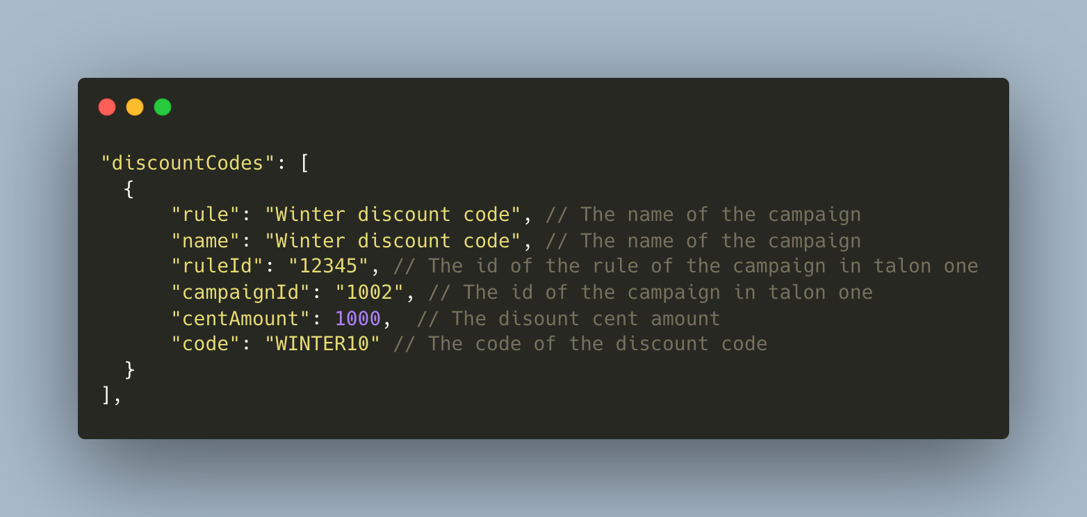 The detailed schemas of the objects are not relevant for this article, but to give an idea, a discount code looks like: