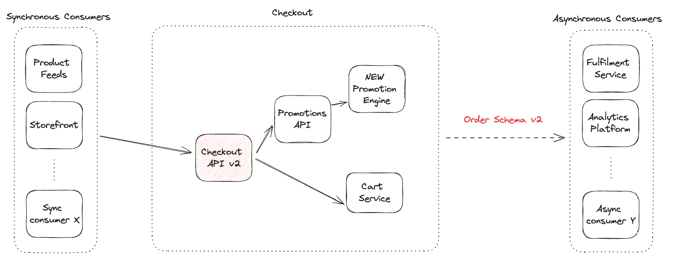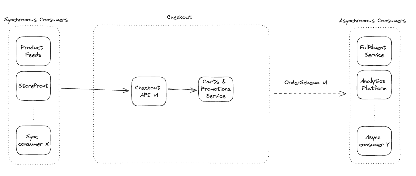 There are synchronous consumers, like our storefront, that interact with carts and promotions using a Checkout REST API. Additionally, there are various asynchronous consumers downstream, for example, services responsible for fulfilling the orders and our analytics platform.