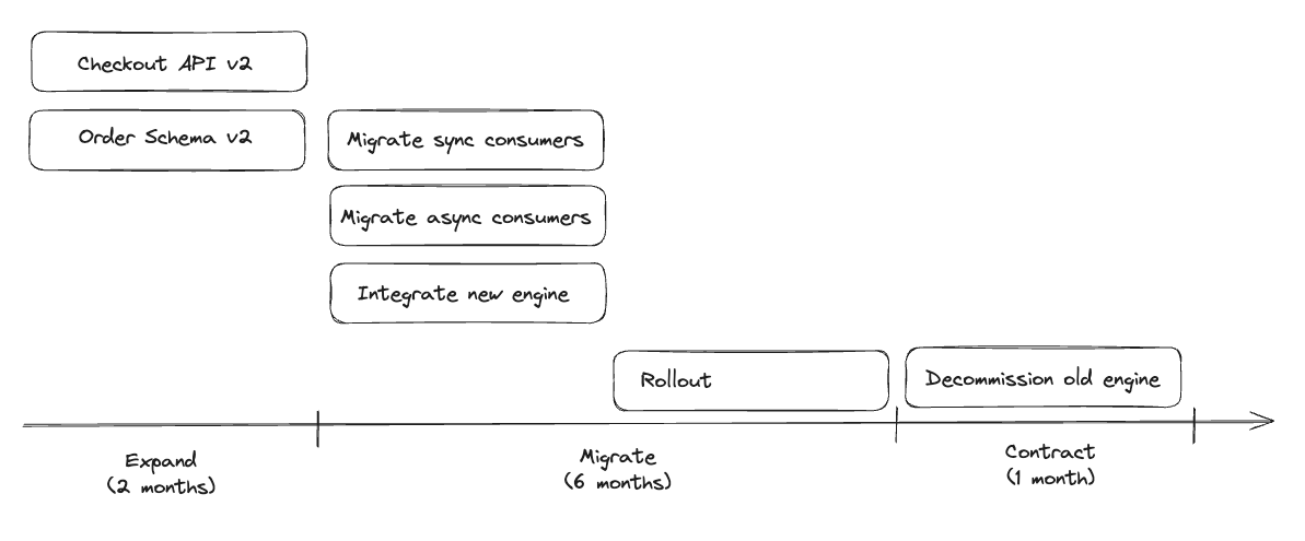 Therefore, we chose to carry out the migration using the parallel change pattern, i.e., in three phases: expand, migrate, and contract. In the first phase, the expansion, we designed and implemented the v2 interfaces for our consumers. Running v1 and v2 in parallel laid the foundation for the migration phase, as all consumers could migrate while the integration team worked on building out the Promotions API and integrating Talon.One.