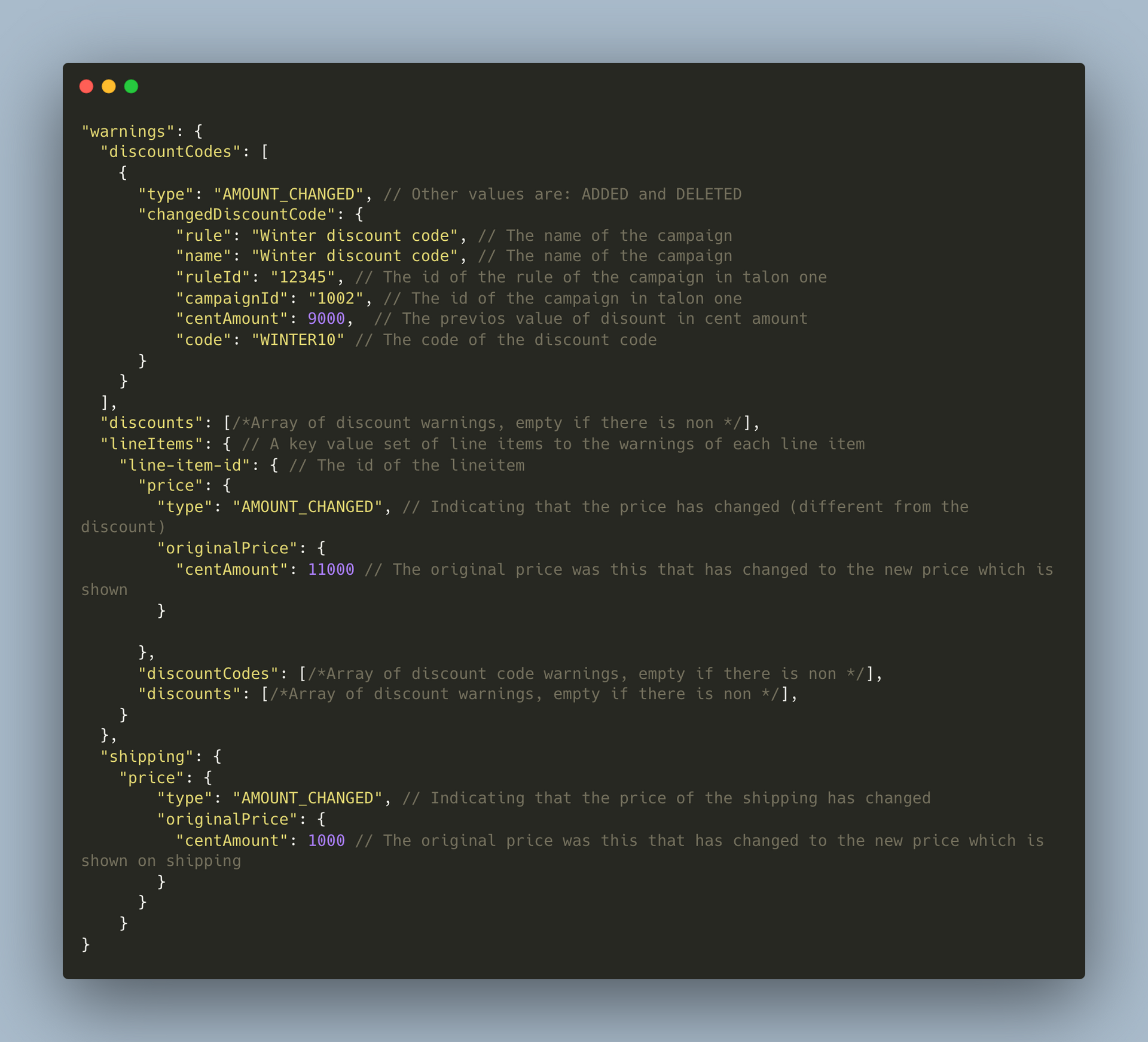 Additionally, we extended the Checkout API with a warnings object. This addressed our previous limitation that we never provided feedback to the customer if there was a price or discount change. The warning object provides information to the client about any price or discount related change that was not caused by any customer action.